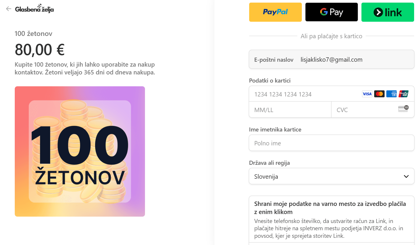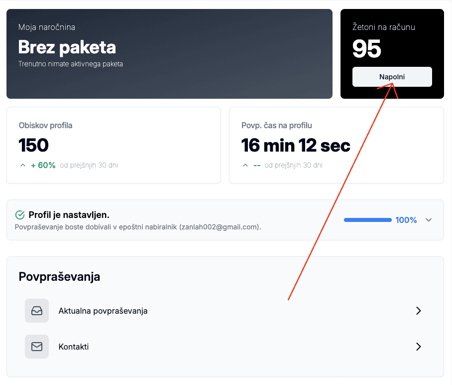 Za nakup povpraševanja in razkritje kontaktnih podatkov morate klikniti gumb "Kupi za 3 žetone". Če še nimate žetonov ali ste jih že porabili, jih morate najprej kupiti.