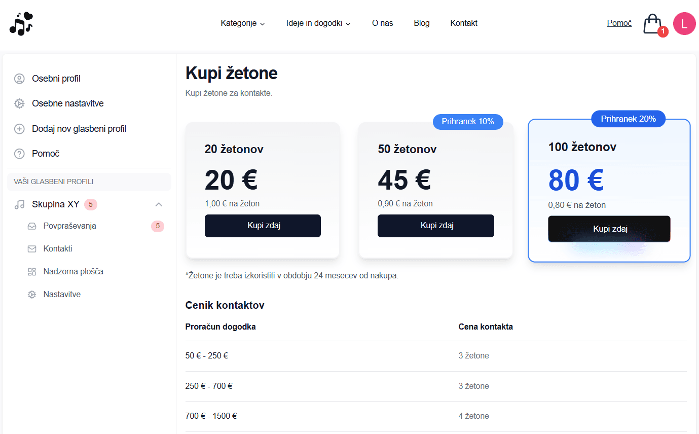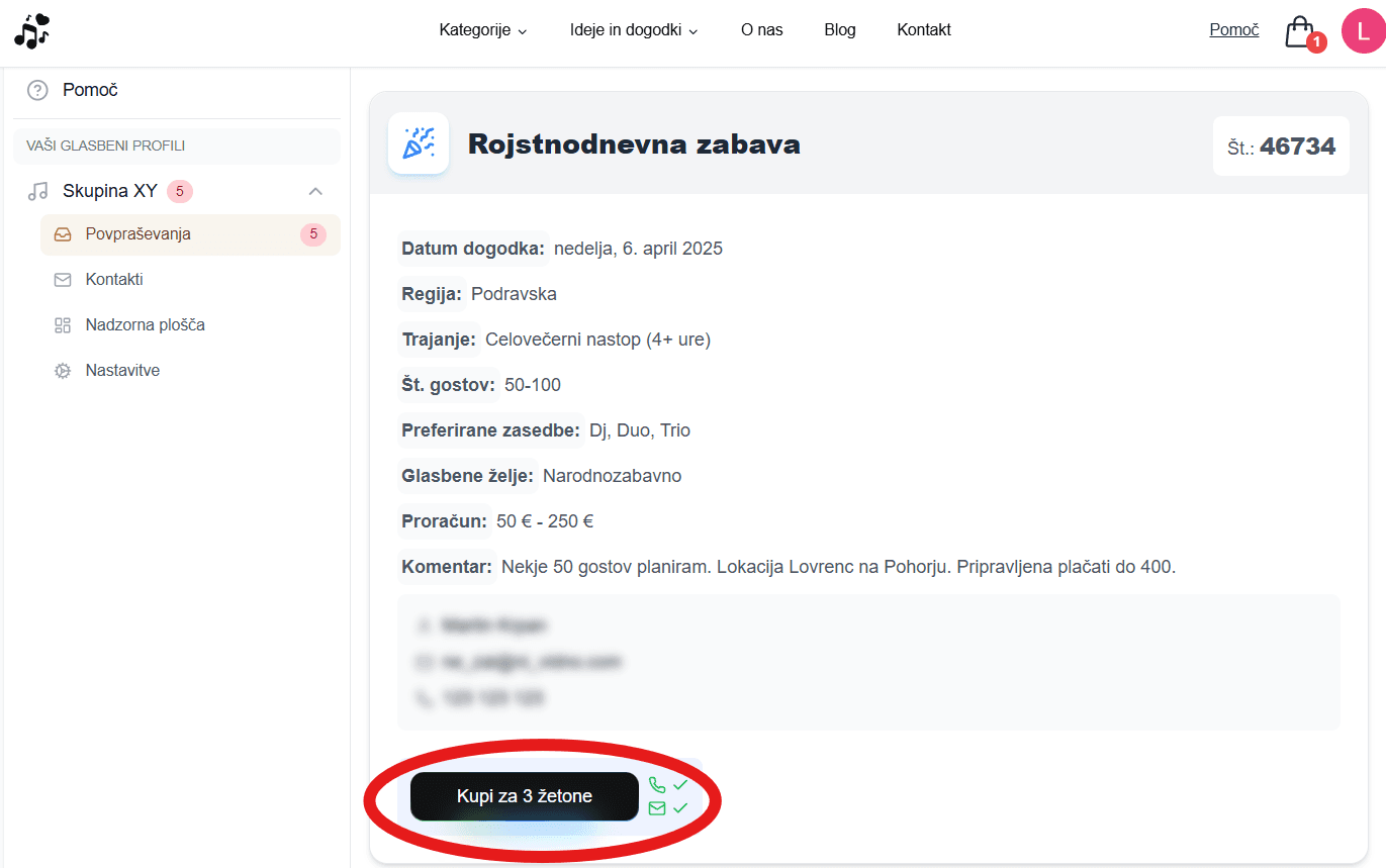 Če presodite, da vas povpraševanje zanima (ste prosti na termin, povpraševanje ustreza vaši ponudbi itd.) preprosto kliknite gumb "Odkrij kontakt". Ta vas bo preusmeril na vaš glasbeni profil na portalu Glasbena Želja, kjer lahko kupite kontakt in pridobite kontaktne podatke zainteresirane stranke.